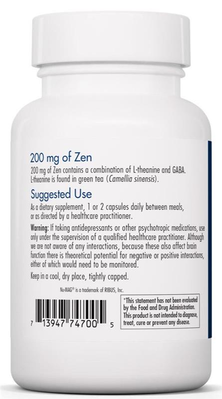 200 mg of Zen offers a unique and natural path to calmness, day or night. This formula contains a combination of L-theanine and GABA. L-theanine is found in green tea (Camellia sinensis) and has been shown to support the production of alpha-wave activity in the brain.